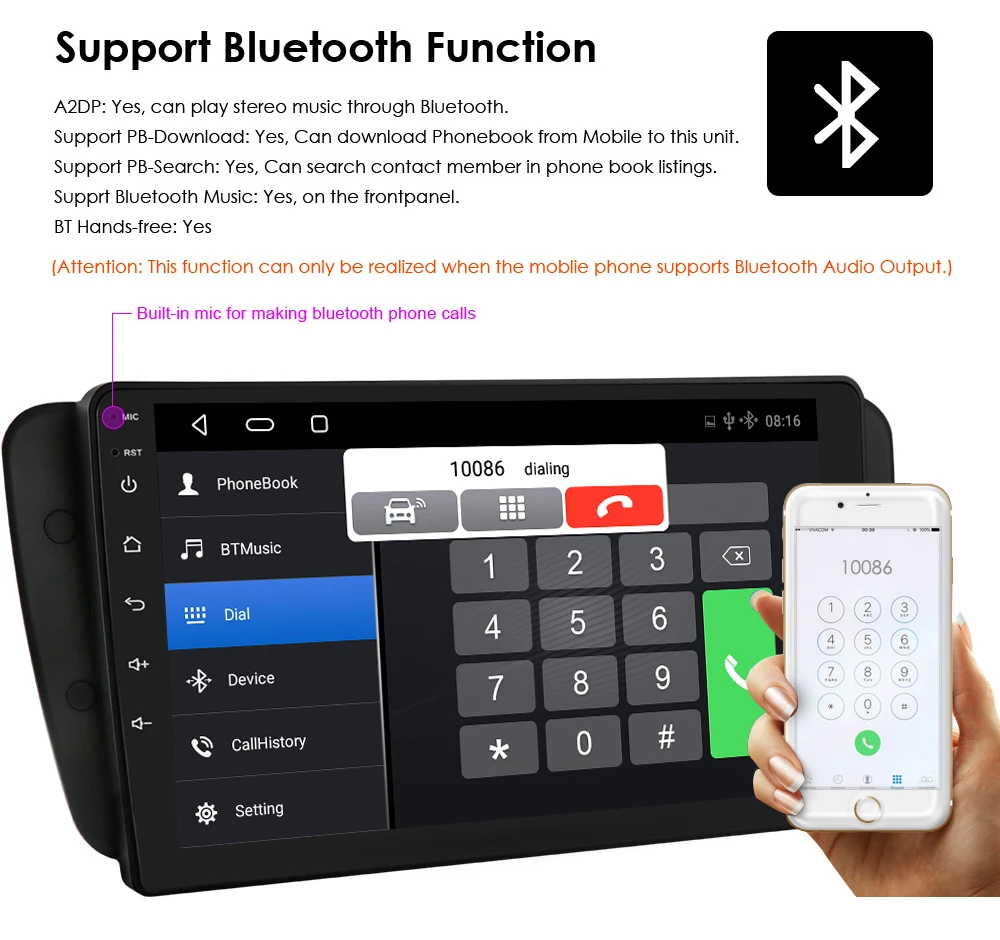 Bluetooth 4.4 built-in, hands-free, phone book, music